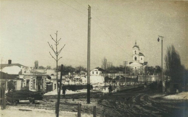Ещё одна важная деталь городского пространства, переданного фотокарточкой – Покровская церковь. Храм был уничтожен в 1930-е годы. Сегодня на его месте построена часовня.