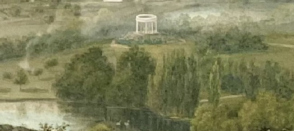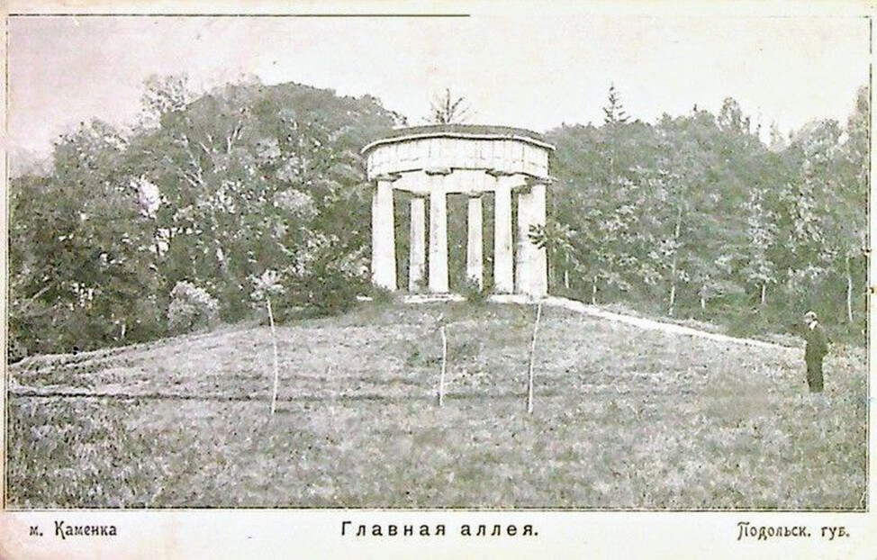 Квинтэссенцией такого отношения и восприятия монарха и одновременно благотворителя стало устройство П.Х.Витгенштейном в процессе создания пейзажного сада в усадьбе в Каменке, вероятнее после смерти императора в 1825 году, отдельного специального места памяти и почитания Александра I. Для этого был возведён искусственный холм, на вершине которого была построена ротондная колоннада с куполом, внутри которой находился бюст на монолитном основании Александра I. Хоть и частичное, но самое первое и раннее изображение этого мемориала сохранилось на картине ноября 1834 года, репродукция которой сегодня хранится в личном собрании у современных потомков П.Х.Витгенштейна (фрагменты картины – Илл.2 и Илл.3) [22].