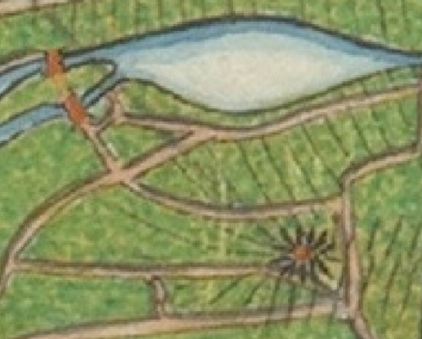 На топографической карте, съёмка местности для которой производилась в 1844 году, отмечено возвышение рельефа и каменное строение на нём (Илл.5) [25]. В 1893 году, уже в период упадка усадьбы и пейзажного сада, М.Боровиковский тоже писал о нём как о беседке: