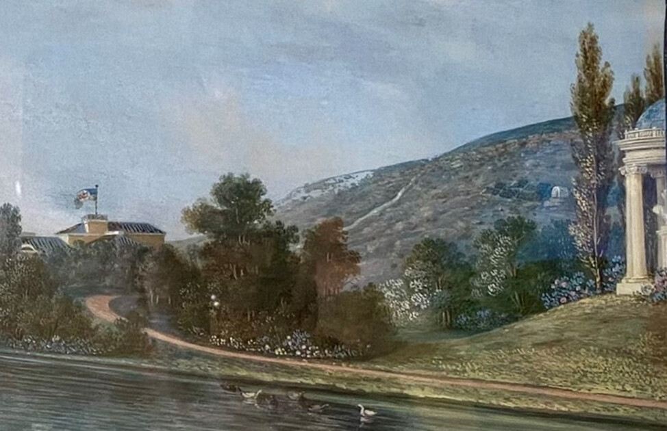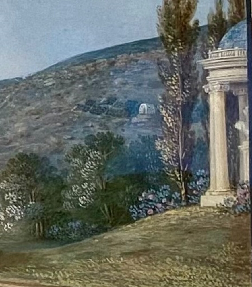 Этот же объект, но уже, вероятно, без купола, представлен на акварели периода 1840-1842 годов, изображающей господскую усадьбу П.Х.Витгенштейна с принадлежащих ей виноградных террас, расположенных на холмах в северной её оконечности (фрагмент акварели – Илл.4) [24].