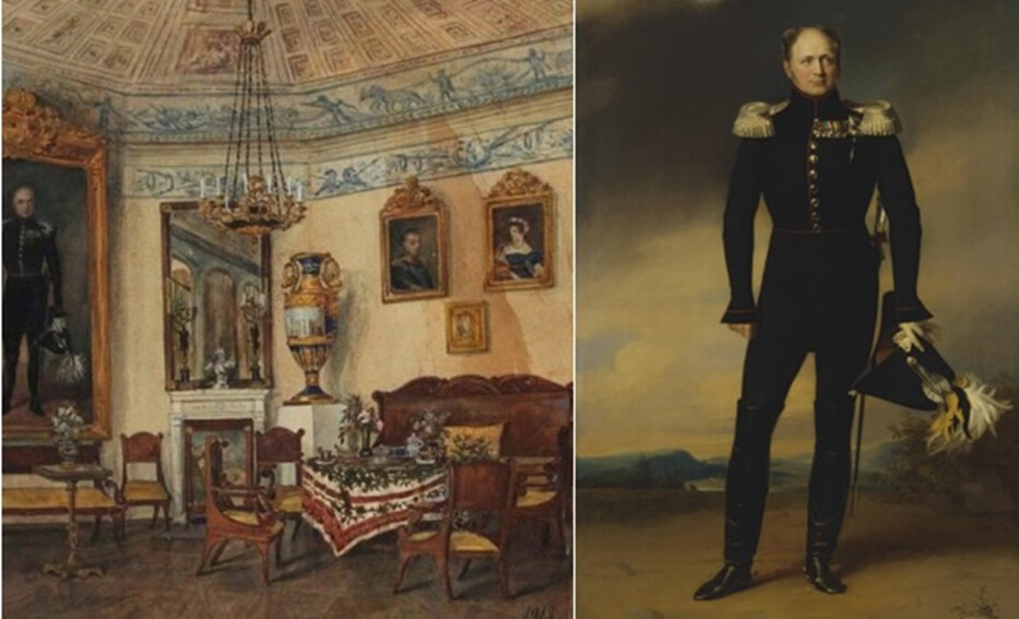Сами супруги Витгенштейны в переписке именовали Александра I не иначе как «наш ангел» (444), а то немалое количество произведений искусства – портретов, картин, бюстов императора и членов его семьи, находившихся в господском доме в Каменке, – свидетельствуют об исключительной и важной роли личности императора Александра в священном и коммеморативном пространстве жизни и судьбы Петра Христиановича и его семьи [19]. Одной из таких работ являлся портрет Александра I (или, возможно, его копия) работы кисти английского художника Джорджа Доу, который частично был запечатлён на картине 1913 года Н.И.Назимовой «Интерьер усадьбы Каменка Подольской губернии» [20]. Эта работа сегодня известна как «Портрет императора Александра I» и находится в фондах музея Эрмитаж в г.Санкт-Петербург (Илл.1) [21].