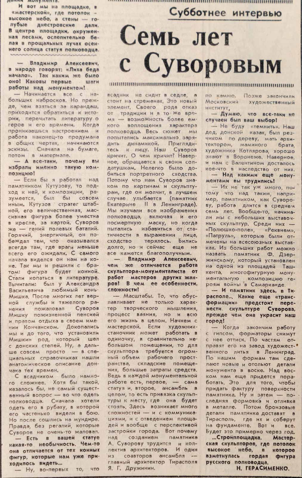 Интервью со скульптором Владимиром Артамоновым в период работы над памятником Суворову, «Днестровская правда», 1976 год