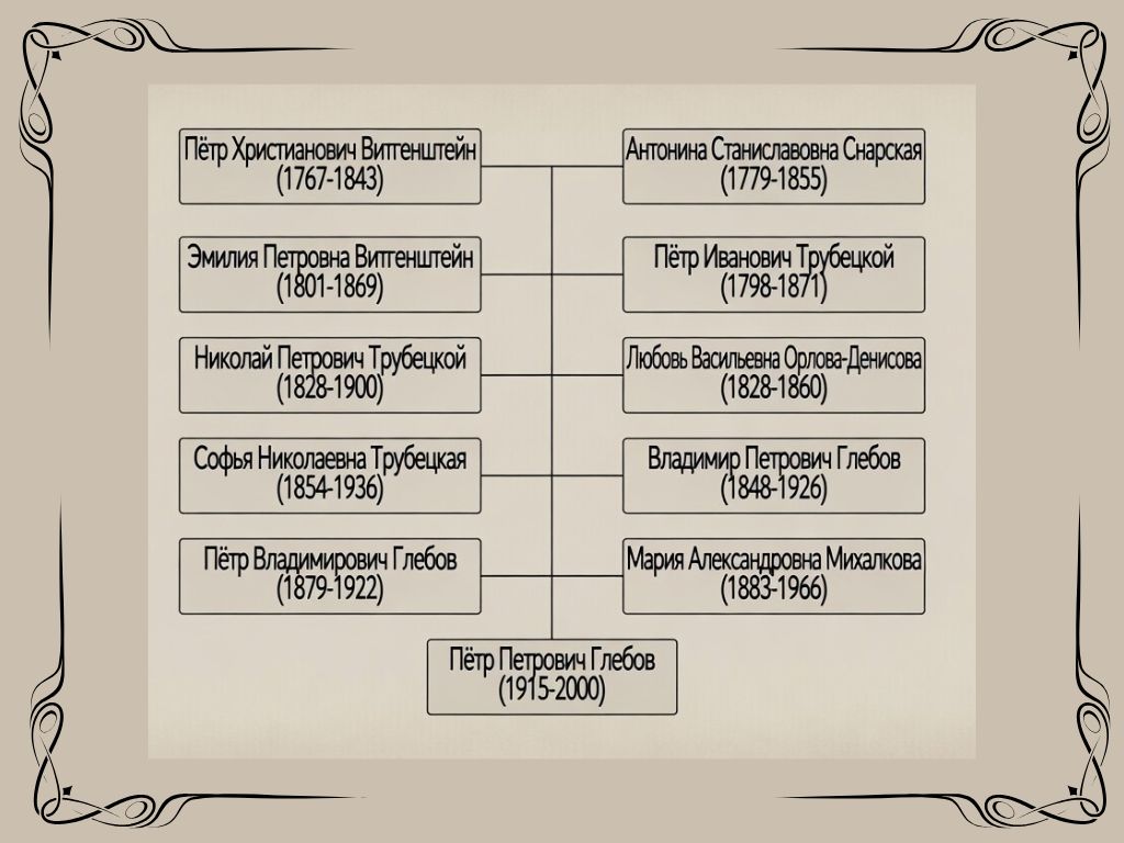 Знаменитый командир лейб-казаков во время Наполеоновских войн, генерал-адъютант, генерал от кавалерии (с 1826) граф Василий Васильевич Орлов-Денисов (1775-1843) был не единственным генералом, чья кровь текла в знаменитом актёре П.П.Глебове. Дочь В.В.Орлова-Денисова Любовь, приходящаяся прабабушкой П.П.Глебову, вышла замуж за одного из сыновей генерала от кавалерии, князя Петра Ивановича Трубецкого, Николая Петровича, мать которого – Эмилия Петровна Трубецкая – являлась дочерью генерал-фельдмаршала, «спасителя Петрополя», князя Петра Христиановича Витгенштейна (См.таблицу). Таким образом, в жилах нашего «казака Мелехова» по отцовской линии текла кровь трёх генералов! Отметим также, что мать П.П.Глебова приходилась родной сестрой Владимира Александровича Михалкова, сыном которого был писатель и поэт Сергей Владимирович, автор современного гимна России, а внук – актёр, режиссёр и сценарист Никита Сергеевич Михалков.