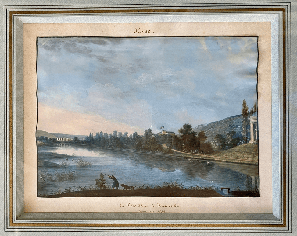 Эта работа неизвестного художника под псевдонимом Хазе (Hase) ранее не встречалась в историографии картины. Автор датировал её ноябрем 1834 года и назвал «Водный объект в Каменке». При этом сам князь Александр обозначил присланный файл как «Охота на уток в Каменке. Хазе».