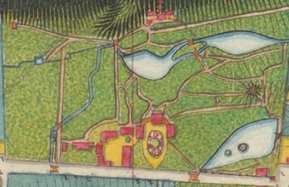 На картине изображён нижний пруд на территории пейзажного сада в усадьбе П.Х.Витгенштейна в местечке Каменка Ольгопольского уезда Подольской губернии. На пруду видны утки, на которых ведётся охота из ружья, очевидно кем-то из хозяев усадьбы, возможно самим П.Х.Витгенштейном или одним из его сыновей. Надо отметить, что представленный нижний пруд являлся частью сложного и уникального для Приднестровья того периода времени гидротехнического сооружения, состоявшего из системы прудов – верхнего и нижнего, – каналов и нескольких шлюзов. Его строительство, как и всей усадьбы, началось П.Х.Витгенштейном в период начала 1820-х годов. Данная система была отображена на топографической карте Каменки в 1844 году. Сама усадьба состояла из северной и южной части, в северной части располагался непосредственно господский дом с пейзажным садом и отмеченным гидротехническим сооружением, а в южной – по документу 1872 года – указывалось наличие овощных огородов, фруктового сада и луговых площадок с терновыми деревьями. На карте 1844 года в южной части были отмечены луг и фруктовый сад, которые отделены от северной части дорогой и двумя мостами со шлюзами, один из которых находился на нижнем пруду, а второй – на канале, отходившем рукавом от верхнего пруда. Очевидно, что вода из этих шлюзов периодически спускалась в южную часть, тем самым орошая луг и фруктовый сад. Таким образом, гидротехническое сооружение усадьбы имело кроме основной эстетической ещё и мелиоративную функцию.